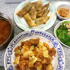 さぁ、完成です。いつものようにご飯を盛り付けてくれ、ソースも盛り付けてくれてました。電子レンジとトースターをWで付けたため、真っ暗に。真っ暗な中ブレーカーを探して、無事電気がON。焦げてしまいましたが、美味しくいただきました。こういうチーズやトマト味の洋風な料理好きそう。