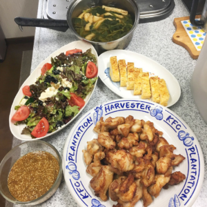 さぁ、完成です。いつものようにご飯を盛り付けてくれ、メインのフライを盛り付けてくれました。(トマトの可愛い切り方レッスンしたものは写真撮り忘れ)(苦手な卵料理も恐る恐る一口食べて、美味しいと。スイッチが入ったように、ものすごい勢いの一機食いでペロリ(笑)苦手克服できたね。