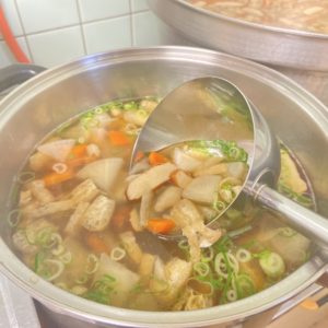 玉ねぎ、ワカメ、人参、しめじを入れました。玉ねぎに含まれているケルセチンの効能強い抗酸化作用を持ち 血管をしなやかで丈夫に 血液をサラサラにする 悪玉コレステロール減らす 脂肪の吸収を抑える効能があります。