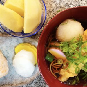 風味の美味しい汁物を御用意致しました。出汁を作り、薄口醤油、塩で味を整え豆腐、若芽、三つ葉を入れます。仕上げに刻んだ柚子の皮を入れて出来上がりです。