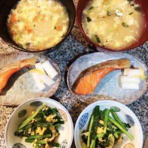 ネバネバ仲間のお味噌汁です。長芋の栄養価は食物繊維・水分ビタミン・Aベータカロテン・ビタミンB・ビタミンC・ビタミンD・ビタミンE・ビタミンK・鉄分・カリウム・マグネシウム・リン・亜鉛等、栄養満点です。ミネラルを不足することで起こると言われている『冬バテ』に効果的なミネラル成分(鉄・亜鉛・カリウム)が沢山含まれています。長芋は水分をとても多く含んでいるので、冬バテの原因と言われている水分不足にも効果的です。なめこのツルンとした食感ととてもよく合いますね!