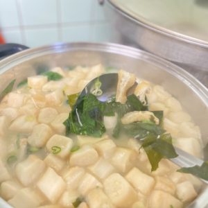 お出汁に長ネギと筍、しいたけをでしっかり旨味を出し、仕上げにふわふわ卵とゴマの香りを(^。^)