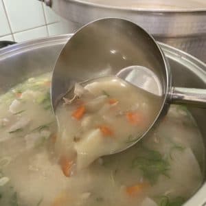 玉ねぎ・舞茸を重ね煮にし、チンゲン菜など野菜を入れて、干し海老を入れ海老の旨味が詰まった中華スープに。