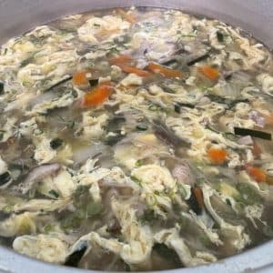 キノコ類・玉ねぎ・人参を重ね煮にして野菜の旨味を引き出し、奥さまが準備してくださっているお出汁に鶏ハムで出た肉汁を入れてスープにしました。野菜の旨味と鶏ハムの肉汁で十分旨味が出ているので、味つけはシンプルに少量の塩胡椒とお醤油のみで味付けしました。