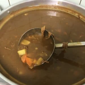 牛肉スライス1.5k、玉ねぎ大8個、じゃがいも大8個、人参大3本、にんにく、しょうが、カレールー色々、コンソメ、チャツネ、ガラムマサラ