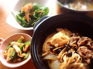 牛肉、焼豆腐、玉葱、人参、白ネギ、しらたき、椎茸、春菊をすき焼き風に煮付けました。すき焼きは、お肉のほかにしろネギやお豆腐、玉葱、しいたけなど様々な具材を使います。また、ぐつぐつ煮込んだ具材を卵につけて食べるのも、すき焼きならではです。そんな、具材をたっぷり使うすき焼きは、栄養バランスに優れています。例えばすき焼きに欠かせない牛肉には、ビタミンB群、動物性タンパク質、レシチンが豊富に含まれています。また、白ネギにはビタミンB1の吸収率を高める役割を持つアリシンなどが豊富です。また、生活習慣病の予防が期待できる健康成分として注目を集めているエリタデニンを豊富に含むシイタケも入っています。このように、すき焼きはそれぞれの食材が助けあってたくさんの栄養を補い合っているため、非常に栄養バランスに優れた食べ物なのです。