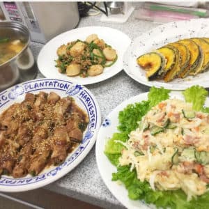 鶏ももは皮側から焼き付けて、長芋は5mm程度の半月切りにして、両面をこんがり焼き付けて、それぞれ焦げないようにいったん、別の器に移動させて、長芋全てが綺麗に焼き色がついた後に、具材をフライパンに戻し、鶏がらスープの素とオイスターソースで仕上げさせて頂きました。