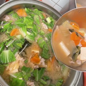 カレースープには焼き野菜にも使ったブロッコリーの茎の部分、人参、飴色玉ねぎと豚肉で煮込みました。