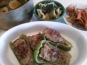 ピーマンの肉詰めを蒸し焼きにしてケチャップ、ウスターソースで作ったタレにフレッシュトマトを入れてソースとしてかけました
