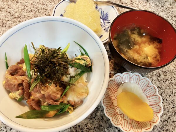 たっぷりのネギと牛肉を卵で閉じて他人丼をお召し上がり頂きました。
