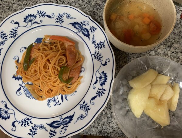 本日は、昼食に、素朴で懐かしい味のナポリタン、酸味をとばして食べやすい一品です。