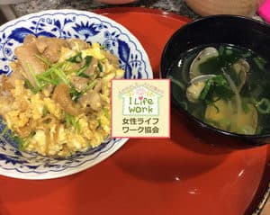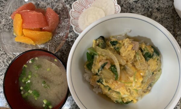 本日は、昼食に、親子丼をご用意させていただきました。ふんわりとろとろな半熟仕立ての卵とだしの相性が抜群でご飯にからんで食欲そそる一品です。