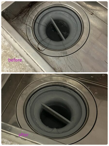 排水溝は毛くずを取り除き、ブラシで磨いて洗い流しています。