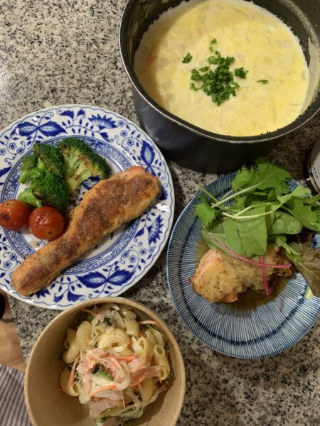 本日は、ご夕食に、秋鮭のピカタをご用意させていただきました。旬の秋鮭がとても美味しそうで、手に取りました。チーズが効いてサーモンが美味しく食べれる一品です。