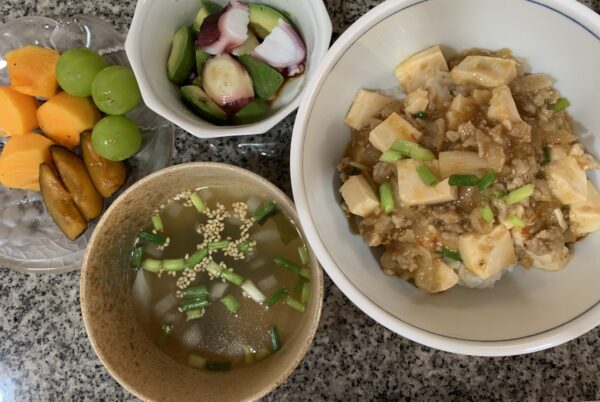 本日は、昼食に、麻婆豆腐丼をご用意させていただきました。にんにくの香りで食欲が出るように、辛味を抑えた麻婆豆腐をご用意させていただきました。