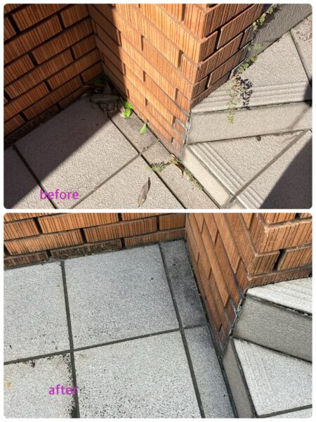 階段の隙間に元気に生えてきた雑草や、隅に溜まりがちな枯葉のお掃除しました。