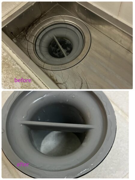 排水溝は毛くずを取り除き、ぬめりが出ないようにカビ取りしています。