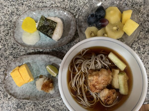 本日は、昼食に、鶏ネギ蕎麦をご用意させていただきました。鶏肉の下処理に上手いタレにつけてお肉を柔らかくして、鶏肉とネギをこんがり焼いてお蕎麦の上に乗せました。