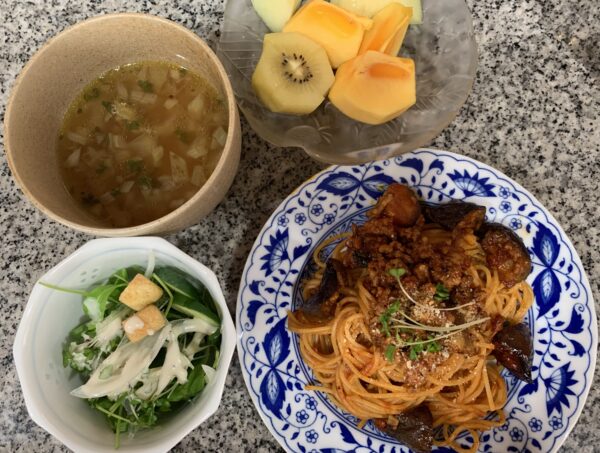 本日は、昼食に、茄子のボロネーゼをご用意させていただきました。旬の茄子とひき肉をでボリューム満点!にんにくの風味がアクセントの一品です。