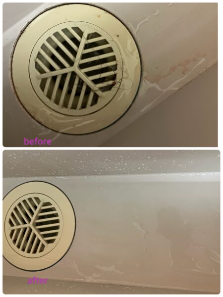 排水溝は毛くずを取り除き、ぬめりが出ないようにカビ取りしています。