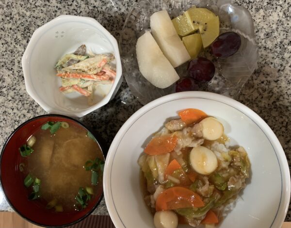 本日は、昼食に、中華丼をご用意させていただきました。野菜の食感を残して、色々な食材の旨味を感じるボリューム満点の一品です。