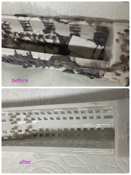 排水溝は毛くずを取り除き、ぬめりが出ないようにカビ取りしています。