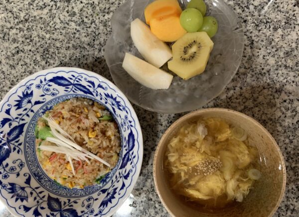 本日は、昼食に、カニレタスチャーハンをご用意させていただきました。レタスのシャキシャキと醤油の香ばしい香りとカニカマの旨みが美味しい一品です。