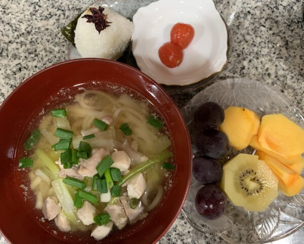 本日はご昼食に鶏ネギ旨塩うどんをお作りさせていただきますました。にんにくと胡麻油の風味が食欲をそそる一品です。大豆と鶏肉でヘルシーな一品です。