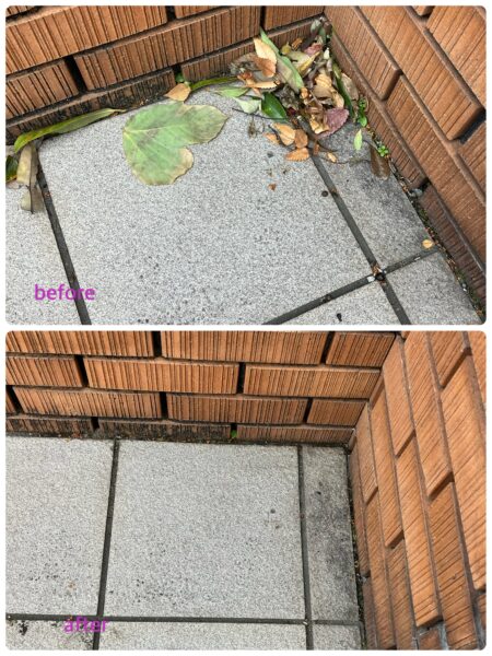 お庭の奥のお掃除は完了していただいていたので、玄関周りや、ガレージ前の枯葉のお掃除しました。