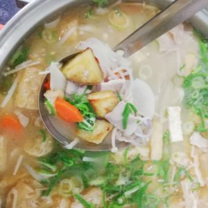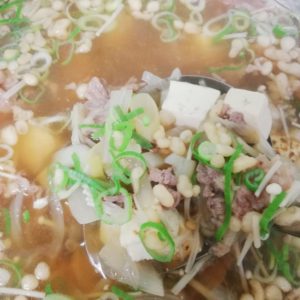 鶏肉や魚介を加えて火を通し、醤油・みりんで味を調えて仕上げました。