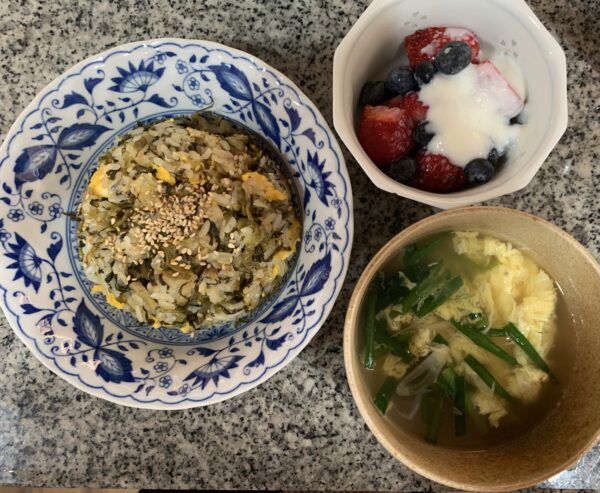 本日はチコちゃん様からリクエストいただき、ご昼食に高菜チャーハンをお作りさせていただきまました。高菜の歯ごたえとふわふわ卵が美味しい一品です。