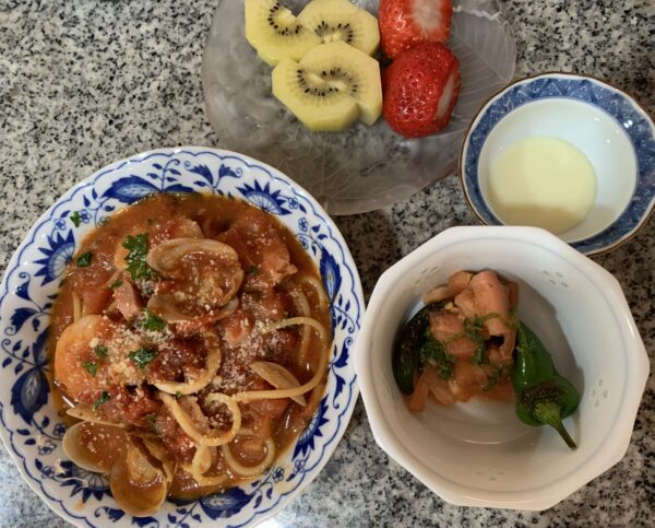 本日はご昼食にシーフードトマトスープパスタをお作りさせていただきまました。シーフードの旨みたっぷりのトマトスープが食欲がそそる一品です。