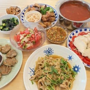 鍋にだしを張り、豚肉と野菜を用意しました。