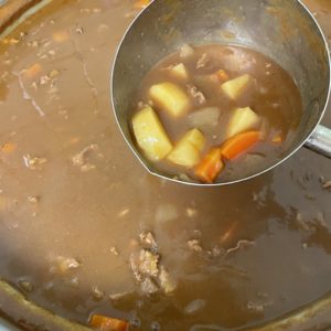 鶏肉と人参をだしで煮て、麺つゆ、さつまいも、厚揚げを加えました。